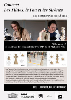 Les élèves d’Ulis assisteront à un concert « Les Flûtes, Le Fou et Les Sirènes » des sculptures et des instruments de musique. Ce concert est à la restitution de la résidence d’artistes du collectif Mille au carré, au LP Alphonse Pellé, aux côtés des élèves de Terminale Bac Pro Technicien Menuisier Agenceur dans le cadre du Territoire Educatif Rural